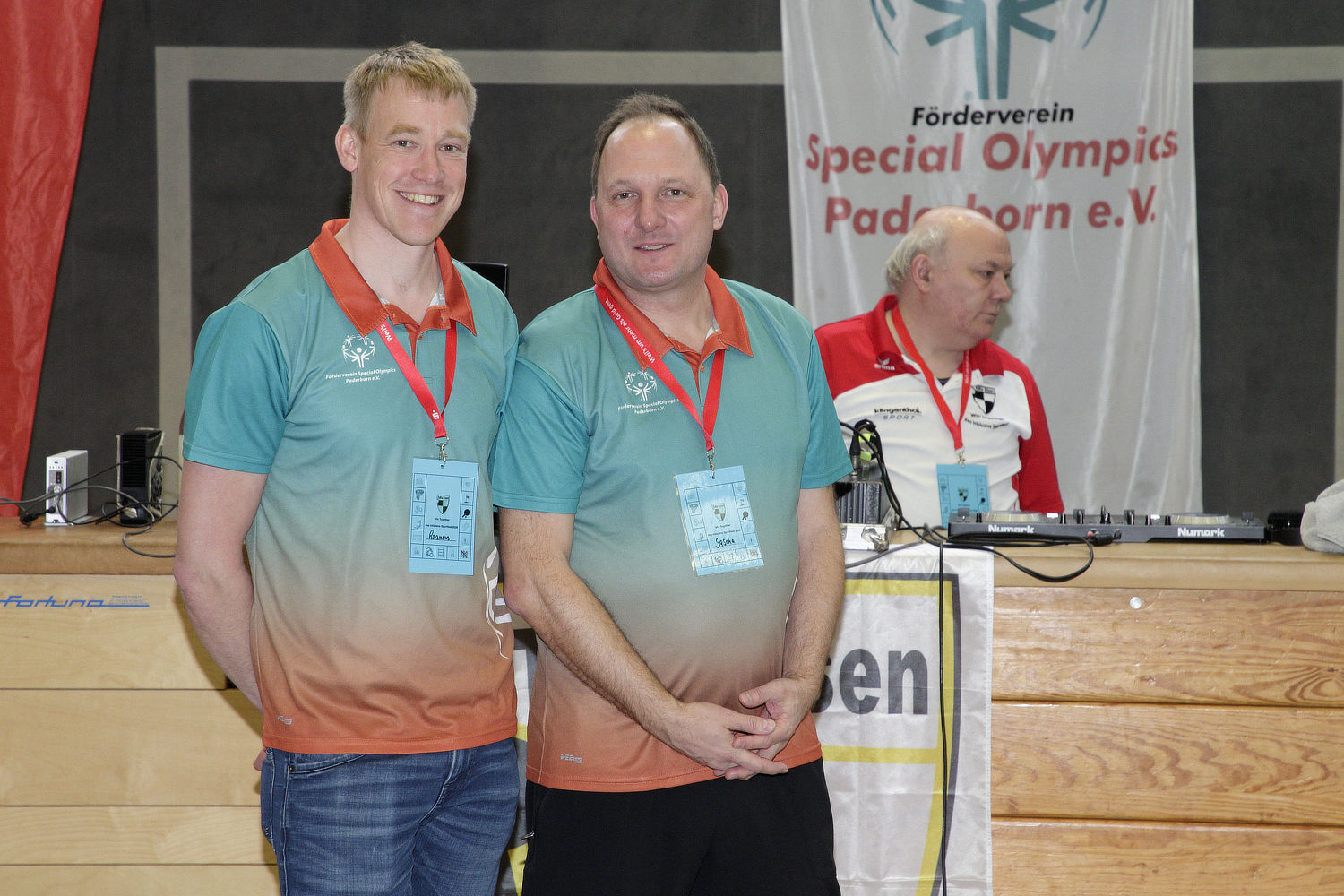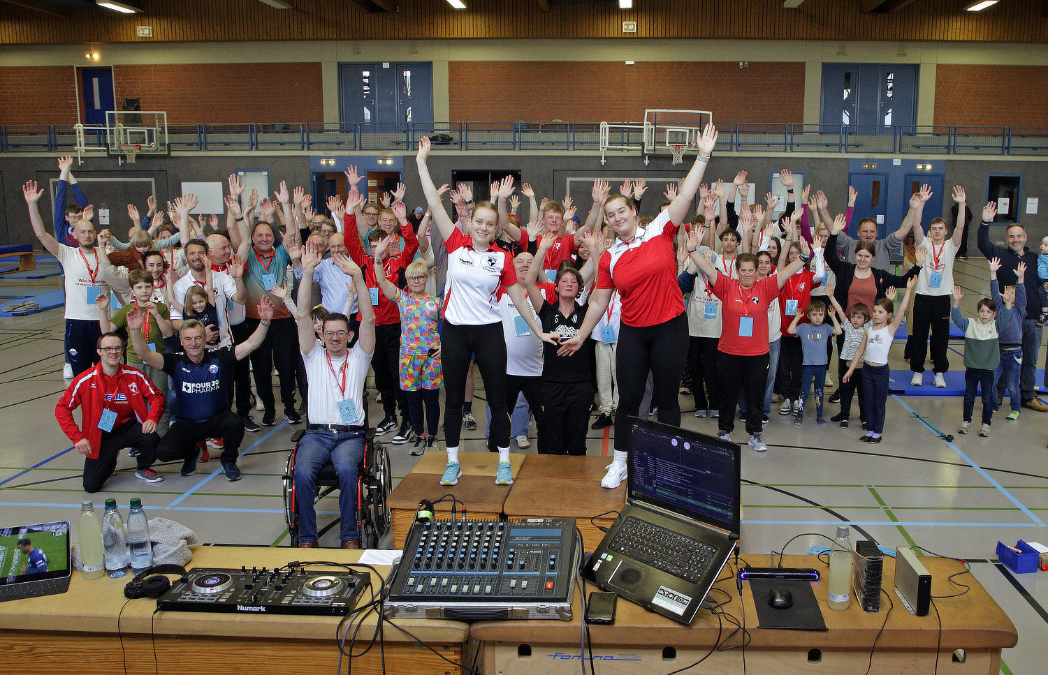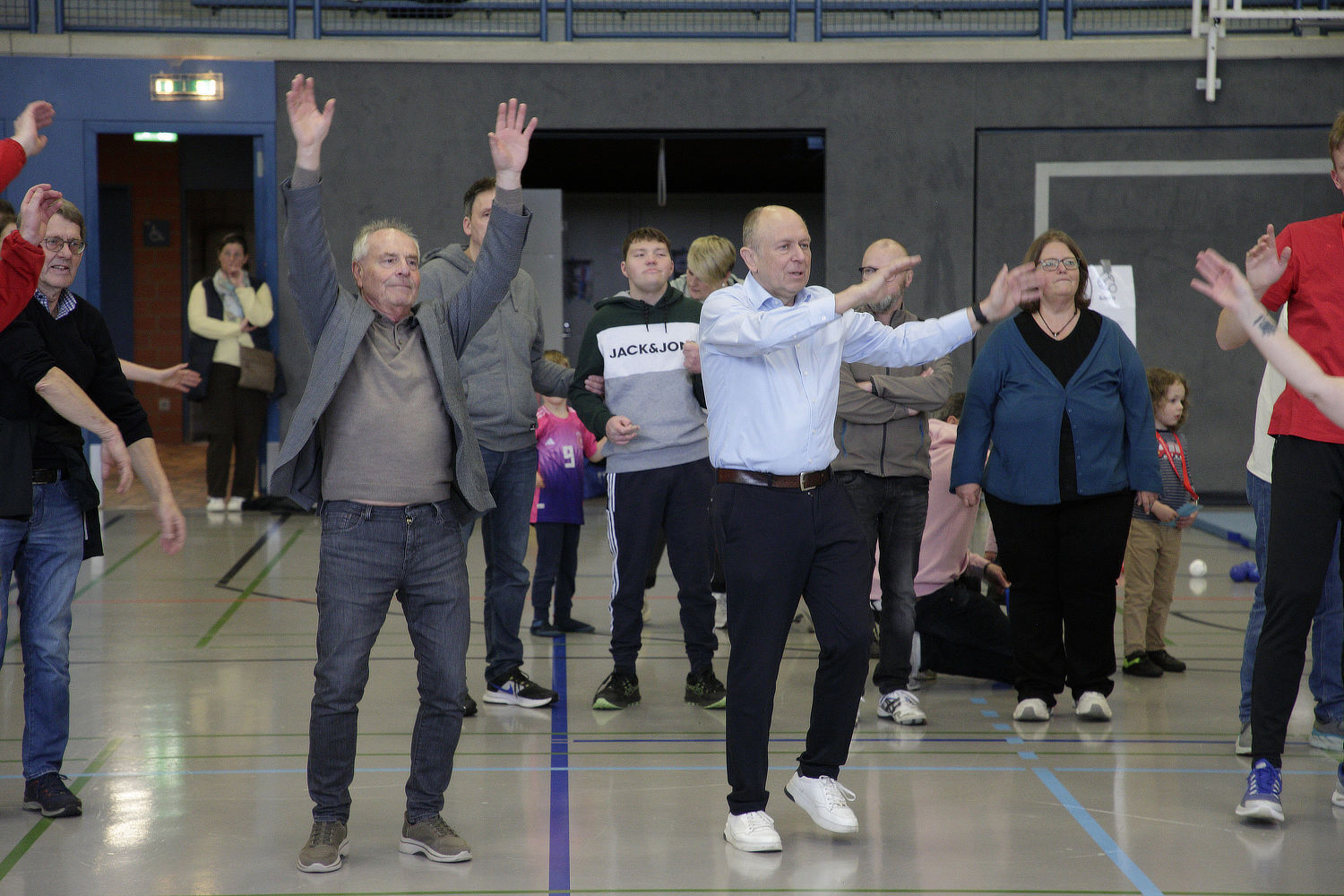 Eines der Grußworte seitens der Ehrengäste sprach der Kreissportverbandsvorsitzende Diethelm Krause, ehe er beim musikuntermalten Aufwärmprogramm ein sportliches Tänzchen mit Landrat Christoph Rüther auf den Hallenboden legte. "WinTogether ist mir eine Herzenssache, nur ganz wichtige Gründe können mich davon abhalten, hierher zu kommen", erklärt Krause, "ich habe zur Inklusion ein besonderes Verhältnis und immer ein offenes Ohr."