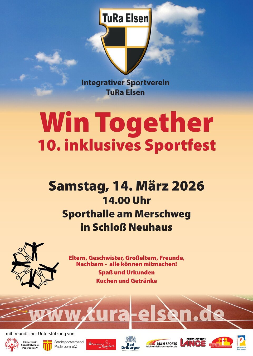 Die 2026er-Ausgabe des inklusiven Sportfestes "Win Together" der TuRa Elsen findet am Samstag, den 14. März 2026 von 14:00-16:30 Uhr in der Sporthalle am Merschweg in Schloß Neuhaus statt.
