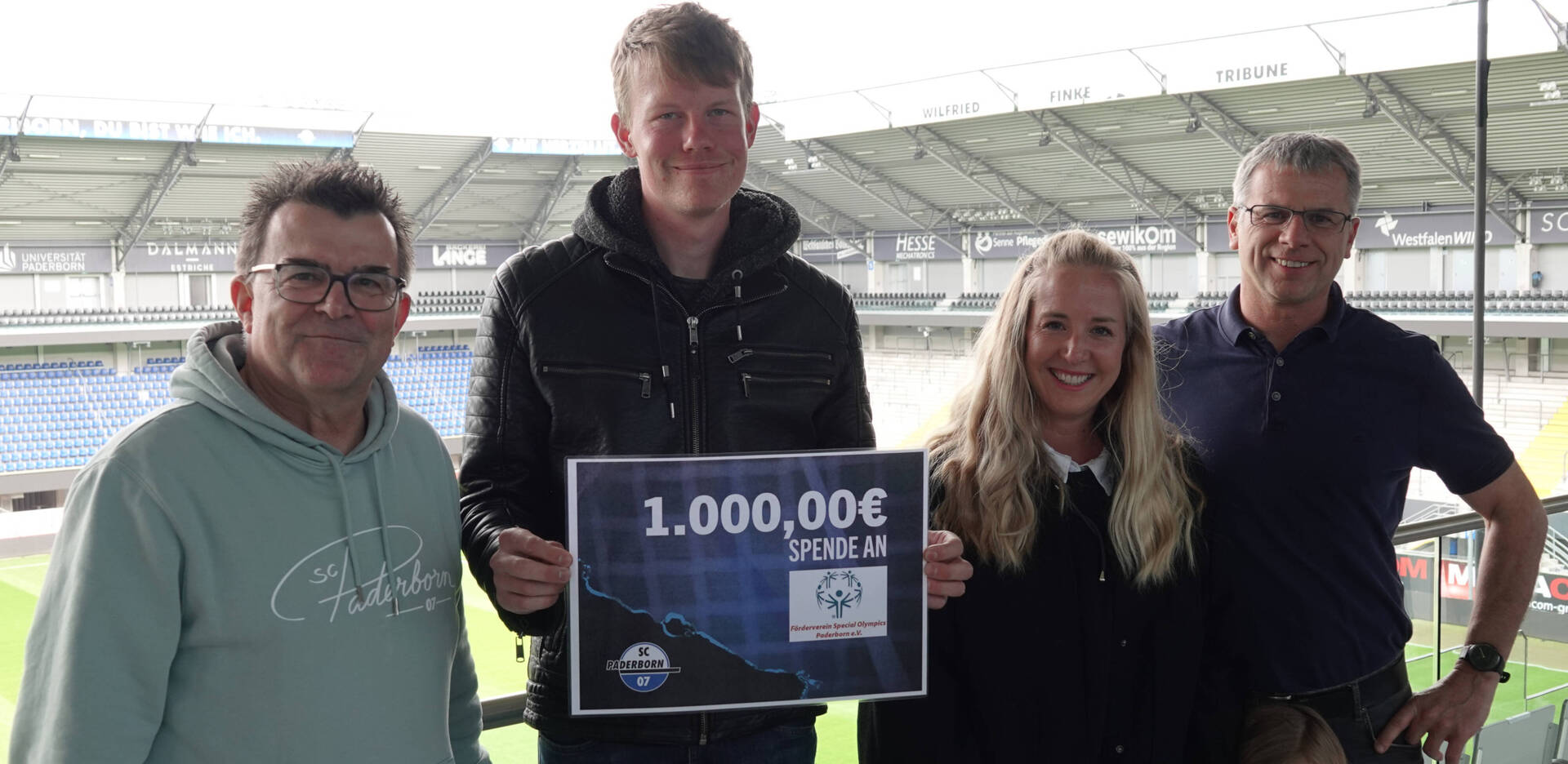 SCP07 Geschäftsführer Martin Hornberger und Irina Hellmig überreichen den Spendencheck an Luca Davidhaimann (TuRa Elsen) und Matthias Brumby (Förderverein Special Olympics Paderborn).